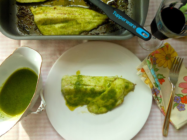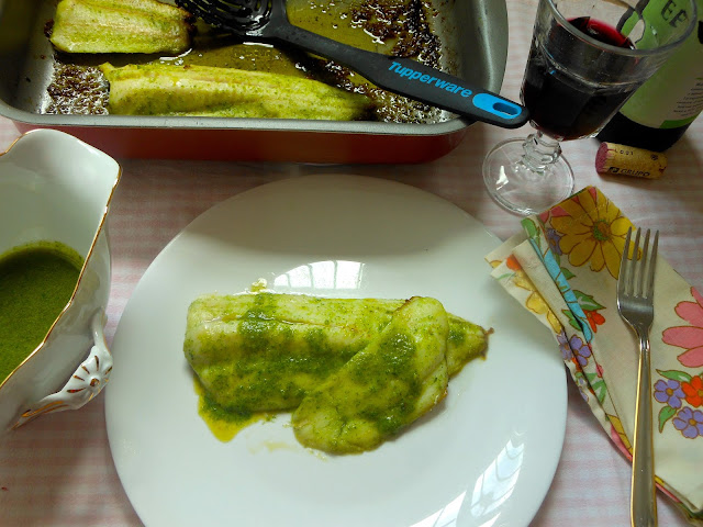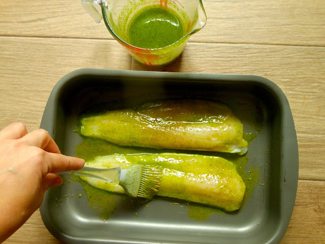 - Seguidamente unta ambas caras de los filetes de merluza con la salsa verde.
