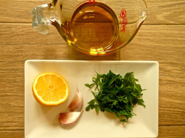 - Seguidamente parte el limón por la mitad, pica el perejil y mide el aceite.